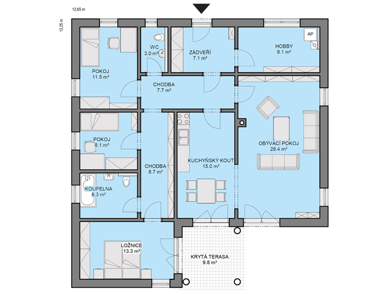 Přízemní stavby nabývají v posledních letech na oblibě. Projekt Bungalovu odkazuje na tradici prostorných přízemních domů, které navozují pocit volnosti, exkluzivity a výjimečnosti. Promyšlené dispozici dominuje velký obývací pokoj s kuchyní a jídelnou. Pudorysné řešení vytváří přirozené atrium, soukromý prostor s krytou terasou umocněný osobitostí klasických sloupů. Dům umně kombinuje formu a funkci s neotřelým designem. Už jeho základní provedení nabízí širokou variabilitu uspořádání. Na přání lze stavbu upravit a rozšřit o další obytný prostor, garáž nebo dílnu.